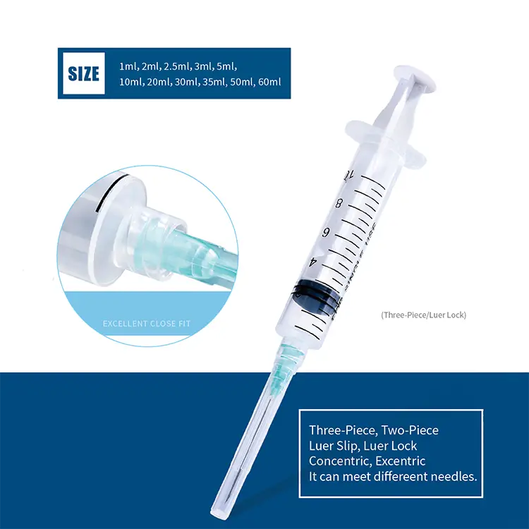 Tip Type:Centric Tip disposable syringe is designed with the tip positioned at the center of the bottom end. This type of tip is commonly used for standard injections where the needle needs to be inserted at a perpendicular angle to the skin or other surface. The centric tip provides accurate placement of the needle and prevents the needle from wobbling or moving during the injection.
